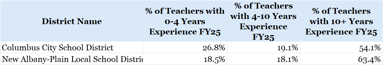 Columbus teachers make $75,219 a year. New Albany’s make $78,299. Meanwhile, here are the relative years of experience for each district: