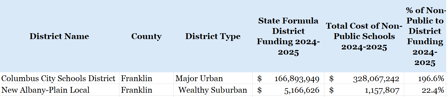 In addition, while the state last year funded privately run schools for 144 New Albany students — 3.1 percent of its public school enrollment, privately run schools for more than 30,000 Columbus resident students were funded — 72 percent of the total public school students in Columbus.