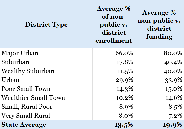 What else do you notice? It’s not just big urban districts like Columbus and Cleveland where you’re seeing this phenomenon. Rich districts like Westlake, Revere and Rocky River are witnessing this too. Even little Put-in-Bay has more money going to privately run schools2 than the local public school district. In fact, the phenomenon is most pronounced in wealthier suburban districts3.